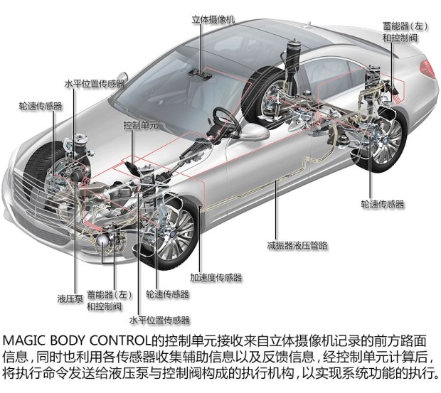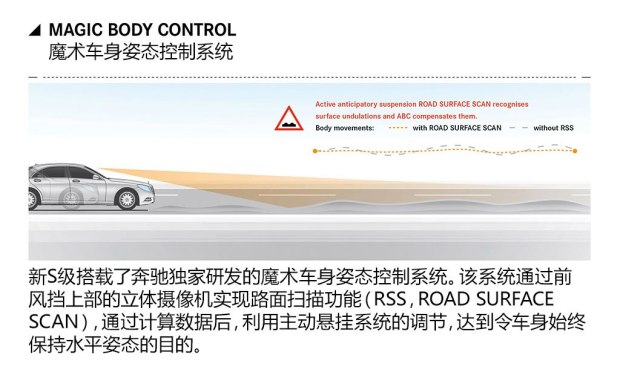 在底盘技术方面,新S级第一次加入了可主动预判前方路况并做出反应的悬架控制系统MAGIC BODY CONTROL(魔术车身控制系统),通过位于风挡上的立体摄像机,装备了MAGIC BODY CONTROL的新S级可以探测到车前方凹凸不平的路面,之后系统迅速反应,通过调整减震器的阻尼来保持车身水平姿态,如同车辆一直行驶在水平路面一样。这款系统目前只可以在S500(或S550)车型上进行选装,而其他型号的新S级则标配了可以连续调整的主动阻尼系统ADS PLUS,以及增强版本的AIRMATIC空气悬架系统。