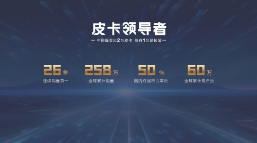 作为皮卡领导者,长城皮卡已连续26年销量第一,全球累计销量突破258万辆。国内终端市占率近50%,中国每卖出两台皮卡,就有一台是长城。长城炮诞生四年多,全球累计用户接近60万,累计43个月销量过万,蝉联中国皮卡销量冠军,创造了“长城炮速度”,让皮卡走进千家万户,成为真正的国民车。
