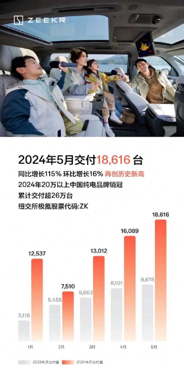【极氪汽车5月销量快报】6月1日,极氪汽车公布了最新交付成绩快报。快报显示,2024年5月极氪汽车交付量达到18616辆,再创历史交付新高,同比大涨115%,环比4月份增长16%。