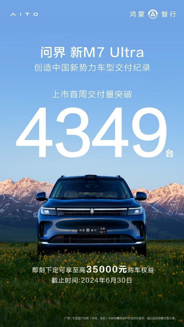 集“超凡驾控、超凡安全、超凡智慧、超凡空间”加超凡颜值于一身的问界新M7 Ultra,目前海量交付已全面开启,预计6月交付量将达到20,000台。6月30日前下定还能享受至高价值3.5万元的首销期购车权益,将福利拉满,为用户带来更多的实惠和惊喜!
