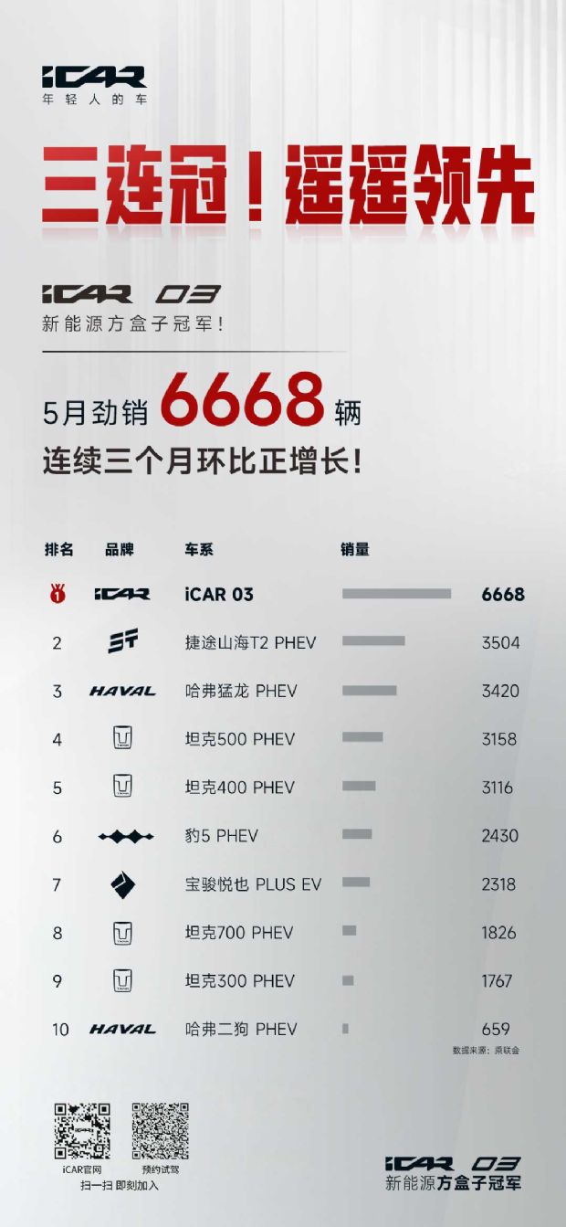 荣耀属于过去,未来更加精彩。iCAR 03以别具一格的潮盒方盒子,拥有超预期操控和智能平权的过硬产品力,引爆年轻用户购车热潮,在五月赢得6668辆的优异成绩,连续三个月登顶,达成三连冠成就,遥遥领先!随着iCAR 03全新智驾版型的上市,我们相信,未来将有更多年轻人加入到iCAR大家庭中来,智享全新潮酷出行生活。
