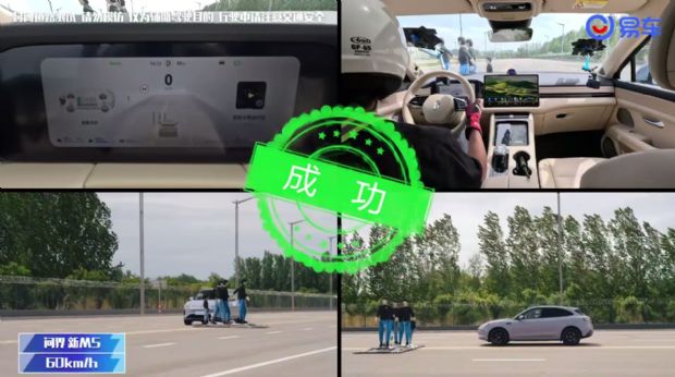 在模拟测试中,易车设置了多个易发生碰撞事故的场景,如静止障碍物、黑夜无灯侧翻车、多人横穿马路等。在这些场景中,问界新M5表现出了卓越的AEB能力。在“90cm 斜列的成排锥桶”测试中,问界新M5在车速高达100km/h的情况下也能及时刹停,避免碰撞风险;而理想L6和特斯拉Model Y在60km/h的车速下却未能完成测试。