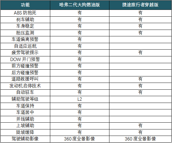 从二者对比的数据当中可以发现,哈弗二代大狗燃油版在主被动安全配置方面是领先于捷途旅行者的,包括车道偏离预警、DOW开门预警、前后方碰撞预警、车道居中、并线辅助等一系列功能,这些功能无论是城市通勤还是长途越野都非常实用,能在发生交通意外时候产生功效,确保每一位驾乘人员安全。