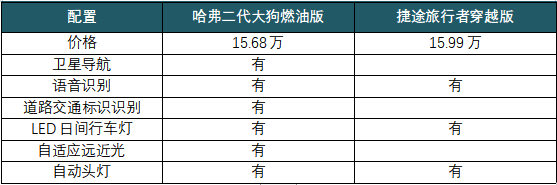 通过对比可以看出,哈弗二代大狗燃油版在售价便宜了3000块钱的情况下,反而多出了卫星导航智驾功能,诸如道路交通标识识别、自适应远近光等一系列人性化功能更是提升了驾乘的整体舒适度,使其更具性价比。捷途旅行者则只有LED日间行车灯、自动头灯等寥寥配置,更多智能配置只有17万以上的高配车型才有搭载,亟待后续补充完善。