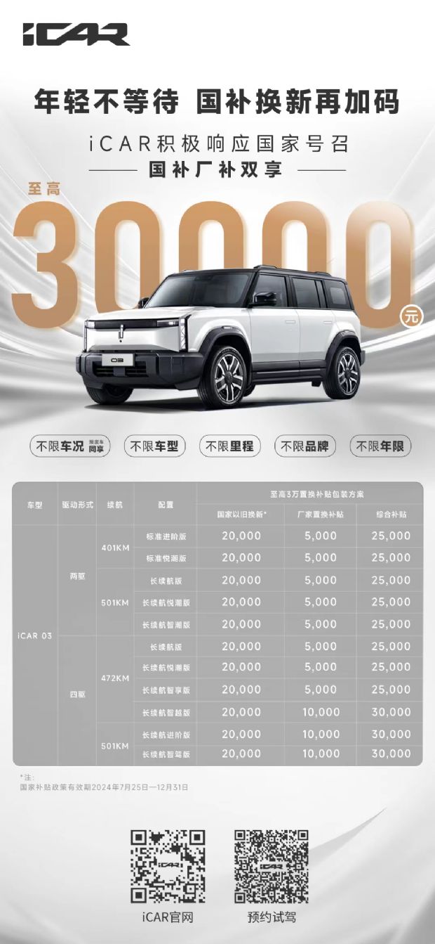 值得一提的是,近日,国补换新再加码,iCAR积极响应国家号召,国补厂补双享至高30000元,不限车况(报废车同享)、车型、里程、品牌和年限,轻松入手iCAR 03,年轻无需等待,快乐开启无忧“铝”程。