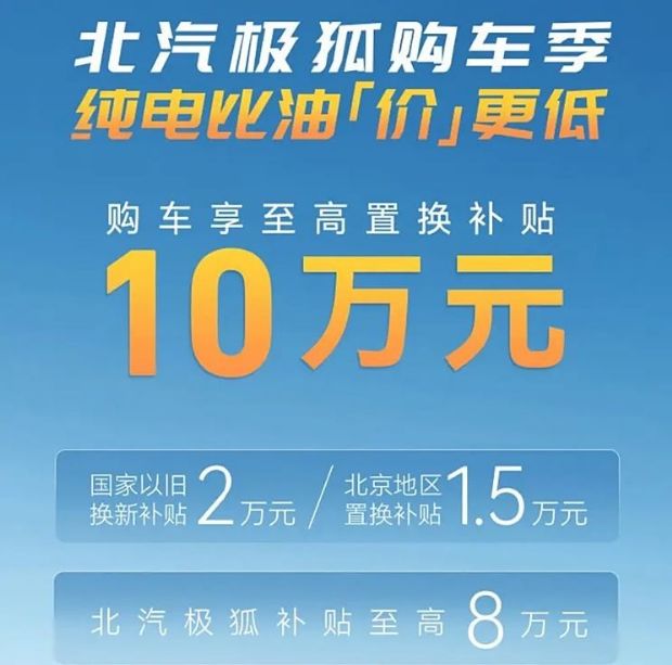 【北汽极狐推置换补贴优惠政策】北汽极狐官方发布了限时购车优惠,购车享至高置换补贴10万元,其中国家以旧换新补贴2万元,北京地区置换补贴1.5万元,北汽极狐补贴至高8万元。涵盖车型包括极狐 阿尔法S/T森林版(含PRO)、极狐 阿尔法T5、极狐 阿尔法S5、极狐考拉S。
