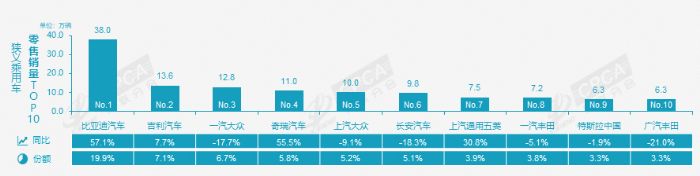 毫无意外,比亚迪汽车依然是汽车厂商销量冠军,8月销量再上新台阶,零售销量达到38.0万辆,同比增长57.1%,销量可谓遥遥领先,囊括了乘用车零售市场的19.9%的份额,市场份额进一步提升。