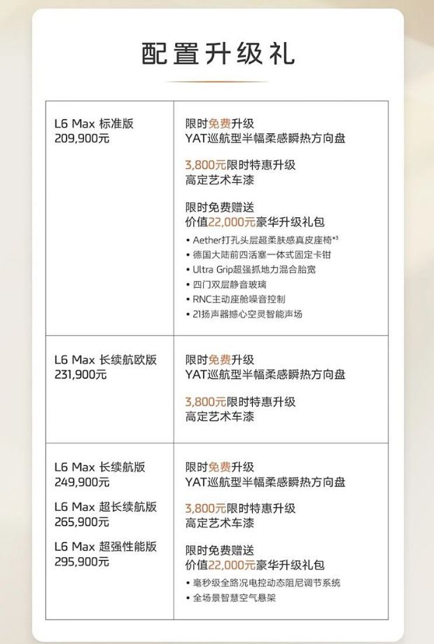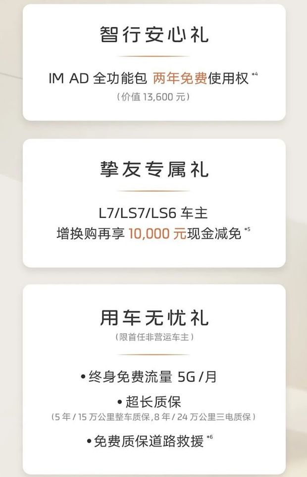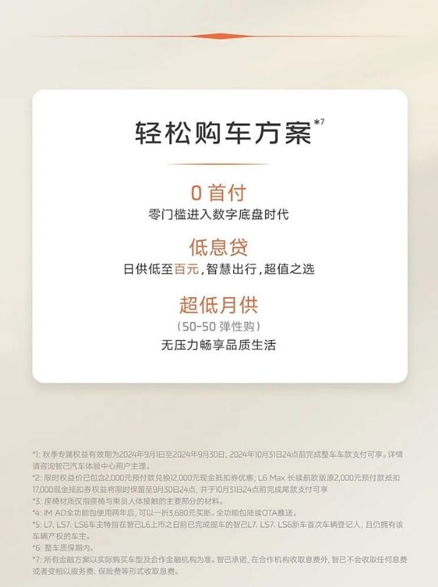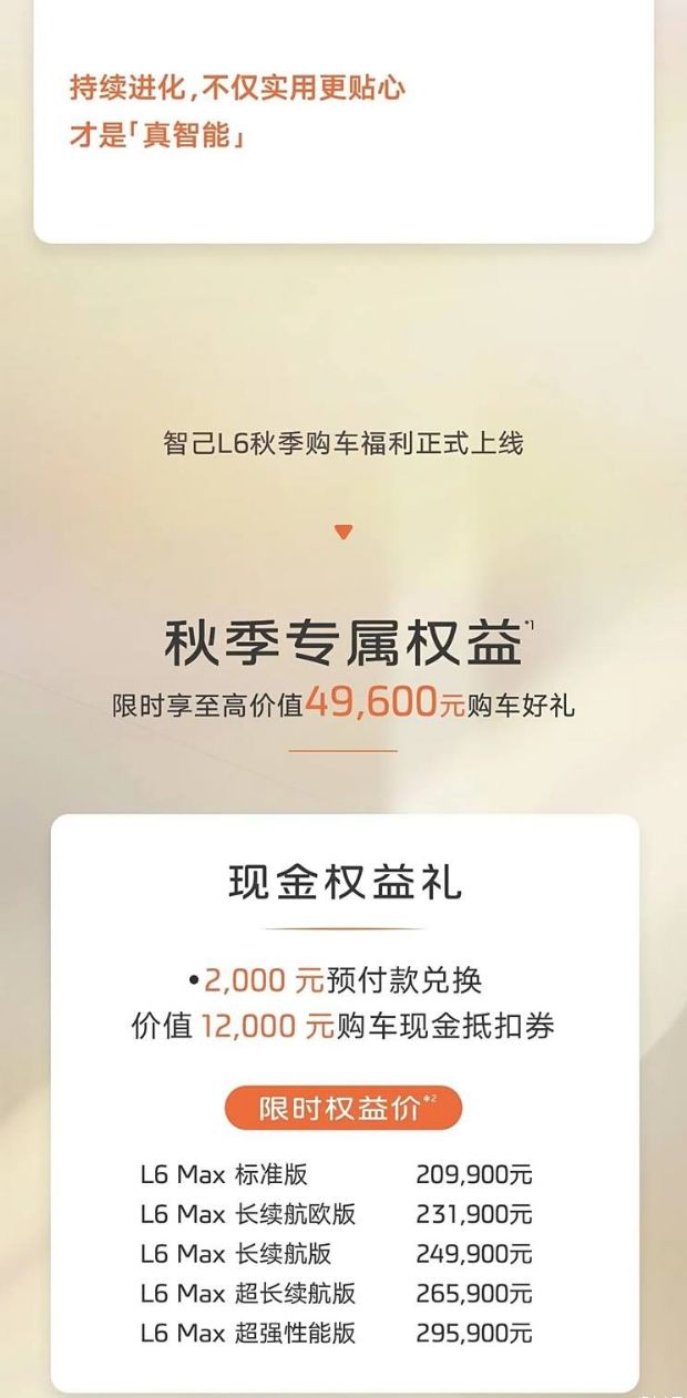 近日,智己L6秋季购车福利正式上线,限时享至高价值49600元购车好礼。2000元预付款可兑换12000元现金抵扣券,智己L6限时权益价20.99-29.59万元,还可享免费升级半幅方向盘、特惠升级高定艺术车漆和豪华升级礼包等等。另外智己还推出了知行安心礼、挚友专属礼和用车无忧礼。