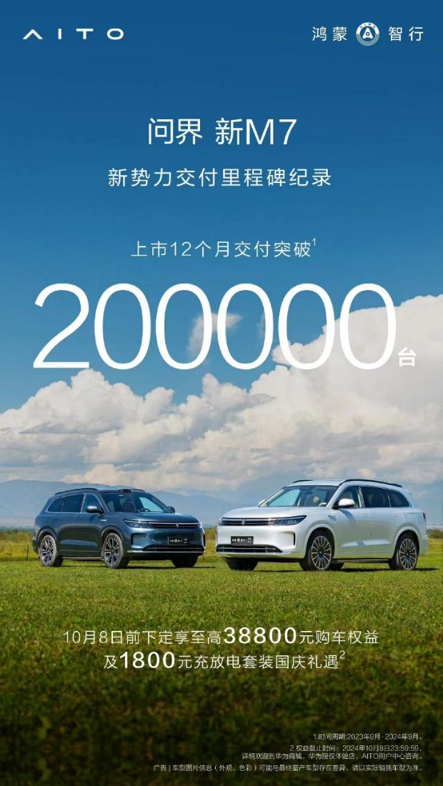 自上市以来,问界新M7在市场上表现强劲。截止2024年9月,这款SUV的累计交付量已突破20万辆,2024年的累计上险量达到14.6万辆,成功跻身国内乘用车市场销量前十,并在国产新能源车型中稳居领先地位。与同类车型相比,如理想L7在达到20万交付量的时间用了15个月,而问界新M7足足提前了2-3个月,这表明其强大的市场吸引力和消费者的高度认可。
