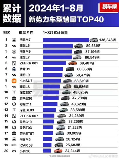 问界新M7不仅凭借其领先的智能安全技术为消费者带来了全新的驾驶体验,更在市场上取得了令人瞩目的成绩。截至2024年9月,问界新M7累计上险量已经达到14.6万辆,销售量则高达14.96万辆,成为SUV市场的佼佼者。在2024年1月至8月的新势力车型销量排行榜中,问界新M7以138,248辆的销售成绩稳居榜首,这也进一步巩固了其作为国民SUV的市场地位。