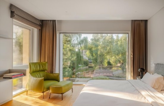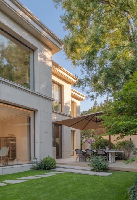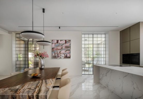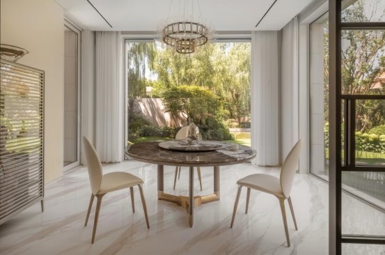 The exterior architecture is remodeled with three levels stacked up, like an artistic masterpiece held up by the earth. The layers of outlines seem to be the wisdom accumulated over the years, telling the dialogue between architecture and nature. Nature and landscape are cleverly introduced into the interior, blurring the boundary between indoor and outdoor. When the sun shines into the house through the large French windows, the warmth is the most affectionate embrace of nature. The green trees and flowers outside the window are no longer an unreachable scenery, but the most moving picture in LIFE. "Picking chrysanthemums under the eastern fence, leisurely seeing the southern mountains." Here, we can have the leisurely embrace with nature without traveling far.