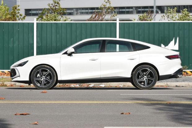 车身侧面,新车采用了溜背式轿跑车身结构,车身腰线采用双段式设计,并在后车门把手上方形成间断式的设计;同时新车前后侧翼子板微微宽出车体,并搭配大尺寸密条辐轮圈以及红色的制动卡钳,展现出了强烈的运动特性。车身尺寸方面,新车长宽高分别为4884/1889/1447mm,轴距为2778mm。