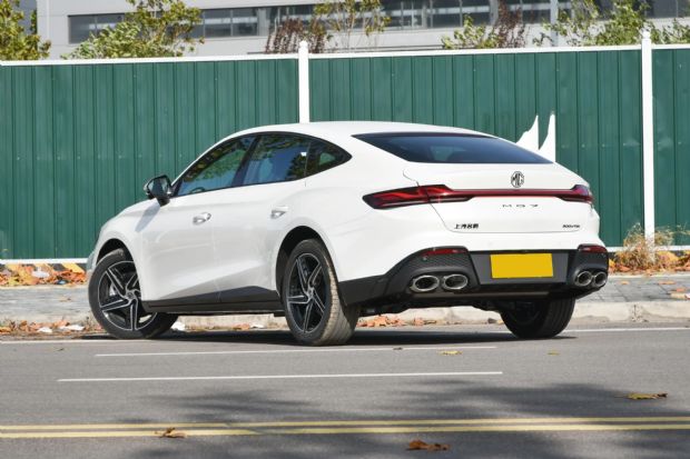 车尾部分,新车的溜背造型与后备厢连为一体,同时采用贯穿式的熏黑尾灯组,并搭配尾部自适应三段式电动尾翼,尾灯主体内部螺旋排列的光源,在点亮后具有一定的辨识度。此外,新车后包围采用了与车身不同色的设计,并搭配双边共四出的排气布局,另外在后备厢中间位置也镶嵌了MG7的标识,以上搭配提升了整车的辨识度。