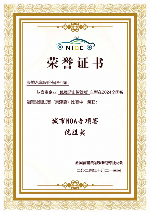 以魏牌全新蓝山搭载的最新一代智能驾驶Coffee Pilot Ultra为例,其基于Orin-X的高算力域控平台,配合27个智慧传感器,全新蓝山实现了行业领先的全场景NOA,100%去高精地图,无论是让老司机都头大的盘龙立交,还是错综复杂的地下隧道,全新蓝山的全场景NOA都能一把过,并且在国内智能汽车领域的顶级赛事——2024全国智能驾驶测试赛(京津冀),全新蓝山在面对涵盖城市、乡村、山路等多种复杂路况的36公里“路考”,依然稳定输出,从众多车型中脱颖而出,荣获了“城市NOA 专项赛 优胜奖”。
