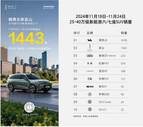 需求,造就市场。消费者对高品质出行需求的日益增长,让高端新能源SUV市场竞争愈发激烈。其中,魏牌全新蓝山作为长城首款全场景NOA智慧旗舰SUV,持续以热销成绩吸引市场目光。据最新销量数据显示,在第47周(11月18日至24日),魏牌全新蓝山以1443辆的周销量位居细分市场第二名,比肩理想L8,坐实大六座市场第一梯队宝座,并远远超越了奥迪、奔驰等一众豪华合资品牌,成为了高端豪华新能源汽车品类的“爆款产品”。