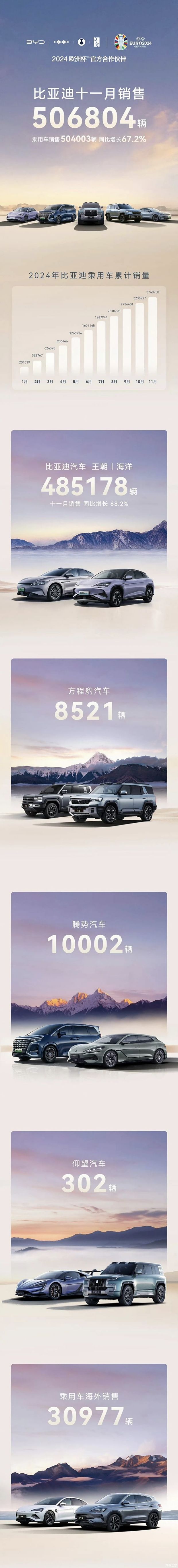 比亚迪发布11月销量数据,共计销量新车506804辆,连续两个月销量超过50万辆,同比增长67.2%。其中王朝和海洋共计销售新车485178辆,同比增长68.2%。方程豹汽车销量8521辆,腾势汽车销量10002辆,仰望汽车销量302辆,乘用车海外销售30977辆。