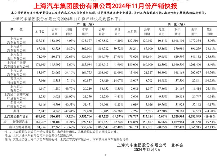 【上汽集团11月销量快报】对于今年前十个月销量同比跌幅超过21%的上汽集团来说,11月算是表现不错的一个月份。上汽集团日前公布的最新销量数据显示,2024年11月上汽集团整车批发销量达到478767辆,同比减少7.06%。值得一提的是,与上月相比,11月批发销量环比增长19.1%,自7月份以来连续五个月实现环比正增长,实现销售回暖迹象明显。