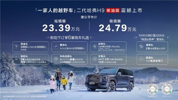 二代哈弗H9柴油版有两个版本,其中拓境版售价23.39万元、极境版售价24.79万元,享受2000元抵12000元购车款+12000元置换补贴等6重壕礼。