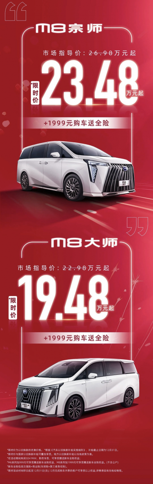 为了回馈用户,广汽传祺在12月推出了M8限时宠粉福利:至高35000元超值焕新礼(国家以旧换新补贴15000元+传祺加码置换补贴至高20000元)和至高15000元的超值补贴礼,叠加后至高可获得5万钜惠。另外年底购买传祺M8,仅需支付1999元就送全险!对于有计划换车的消费者来说,这无疑是一个不容错过的机会。