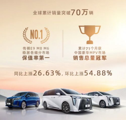 截至2024年11月,传祺MPV累计销量已超过70万辆,中国品牌MPV只此一家。销量不断飙升的同时,传祺MPV保值率也是持续摘冠,旗下的M8、M6等车型连续多次霸榜多平台自主品牌 MPV 保值率第一,足见用户对传祺MPV的充分认可,是当之无愧的中国MPV专家。