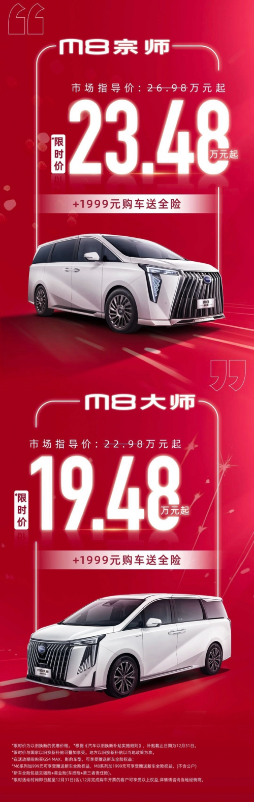 作为消费者,我们乐于见到一个专注造好产品的企业能受到市场认可。广汽传祺为了回馈消费者,在12月推出了M8限时宠粉福利:至高35000元超值焕新礼(国家以旧换新补贴15000元+传祺加码置换补贴至高20000元)和至高15000元的超值补贴,叠加后至高可获得5万钜惠。另外年底购买传祺M8,仅需支付1999元就送全险!对于有计划换车的消费者来说,这无疑是一个不容错过的机会。