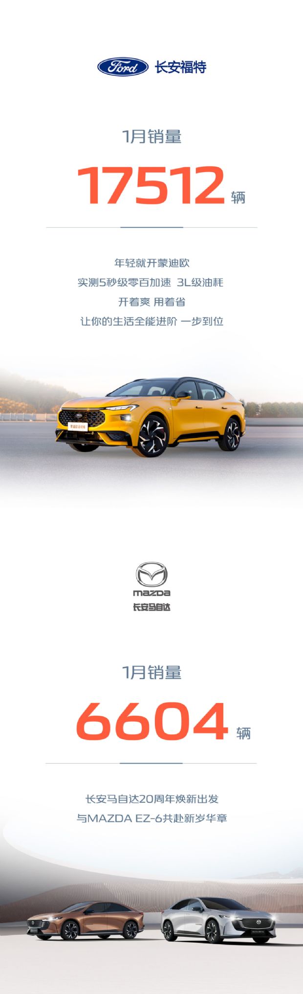 合资品牌方面,长安福特1月实现销量17,512辆;长安马自达销量6604辆。