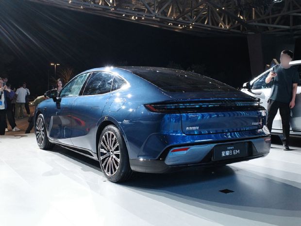 星耀8 EM以"星舰级"设计语言重塑中大型车美学,4.98米修长车身搭配轿跑溜背造型,配合1918mm超宽体车身与2928mm超长轴距,既保留行政级轿车的舒展姿态,又以0.268Cd超低风阻系数诠释运动基因。前脸分体式大灯组与贯穿式尾灯形成首尾呼应,星际巡航轮毂设计更将科技感推向新高度。