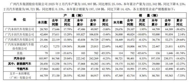 3月7日,广汽集团发布2月产销快报显示,当月汽车批发销量达9.87万辆,同比微增0.33%,但前两月累计销量19.72万辆,同比降幅达14.42%。在行业竞争加剧与消费需求分化的背景下,传统燃油车市场疲软与新能源赛道的强势突围形成鲜明对比。