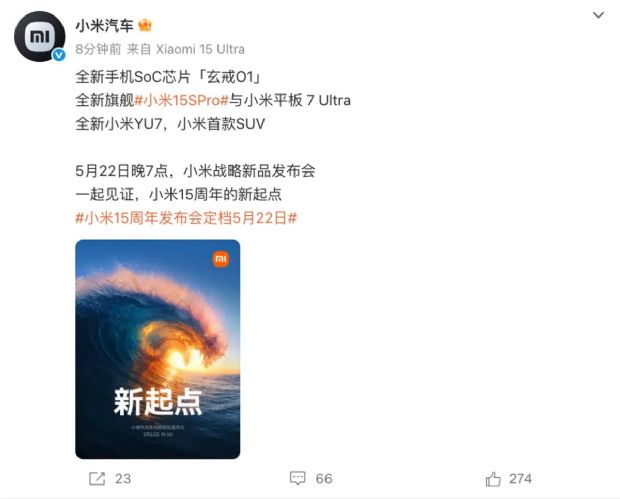 据小米官方最新消息,备受关注的小米15周年战略新品发布会已正式定档5月22日。这场年度科技盛宴将带来三大领域的突破性产品:全新自研手机SoC芯片玄戒O1、小米15系列旗舰新机迭代之作——小米15S Pro、新一代生产力旗舰小米平板7 Ultra,以及小米汽车首款战略级SUV车型小米YU7的全球首发。