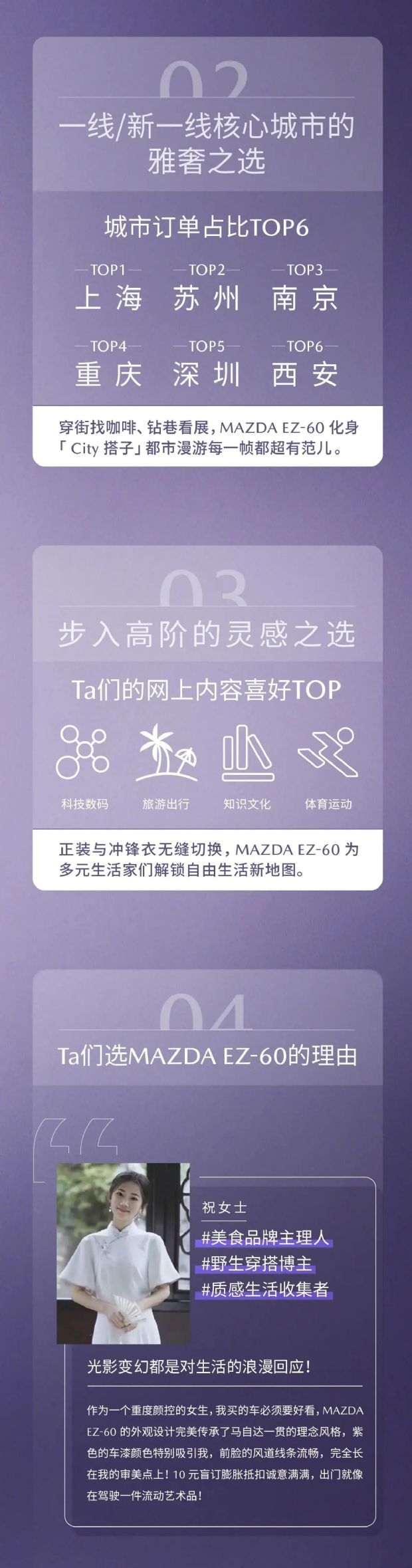从盲订数据来看,EZ-60吸引力十足。超六成订单来自25-40岁新锐青年,他们追求个性、自由与品质。上海、苏州、南京、重庆、深圳、西安等城市订单量位居前列,可见这款车在一线及新一线城市的超高人气。