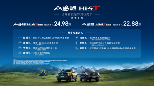 真新能源皮卡山海炮Hi4-T来了!6月23日,“全球首款越野混动皮卡”山海炮Hi4-T正式上市,共推出性能版和全球版两款车型。其中,山海炮Hi4-T性能版建议零售价24.98万元;山海炮Hi4-T全球版建议零售价22.88万元。并为购车用户推出限时礼、置换礼、老友礼等七重大礼,诚意满满,助力用户满电出发!