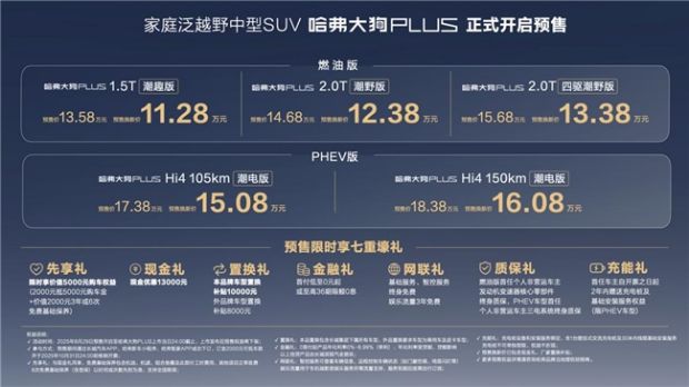 作为哈弗展台的重磅“c位”产品,“为家而来”的哈弗大狗PLUS正式发布预售,现在下订可享受13000元现金优惠,至高10000元置换补贴,预售换新价格11.28万元至16.08万元。其中,哈弗大狗PLUS:1.5T潮趣版11.28万元、2.0T潮野版12.38万元、2.0T四驱潮野版13.38万元。哈弗大狗PLUS PHEV : Hi4 105km潮电版15.08万元、Hi4 150km 潮电版16.08万元。此外,更有先享礼、金融礼、网联礼、质保礼、充能礼可享,包括: