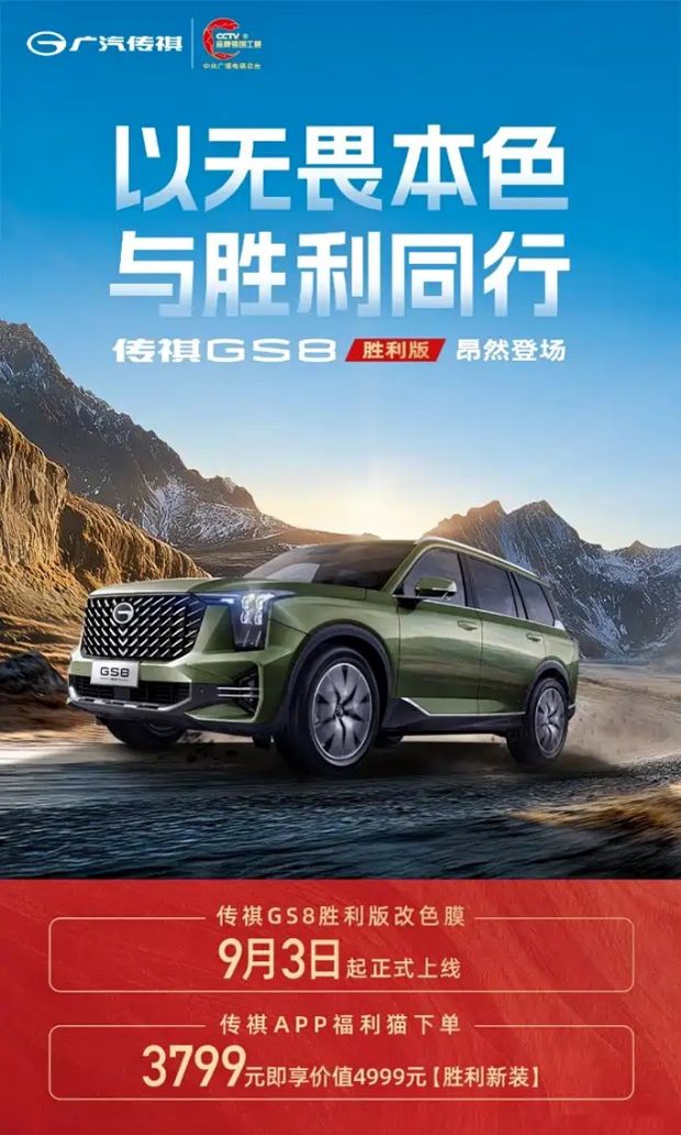 9月3日起,传祺GS8胜利版已在广汽传祺APP正式开售,仅需3799元就能拥有价值4999元的“胜利新装”,性价比优势显著。更值得关注的是,截至9月15日,现役及退役军人与其直系亲属(父母、配偶、子女)购车,还可申领专属爱心补贴,用实际行动传递品牌温度。