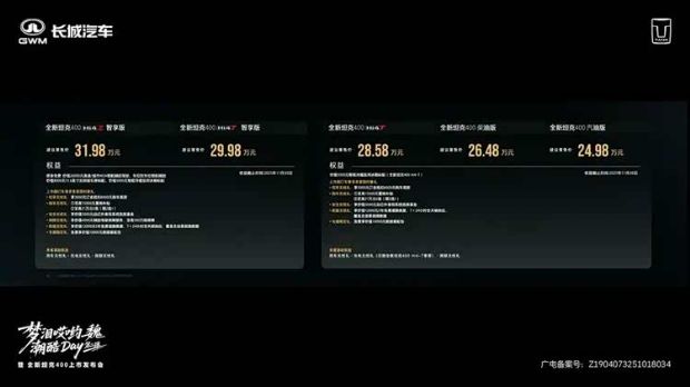 全新坦克400正式上市 售价24.98-31.98万元 增加激光雷达