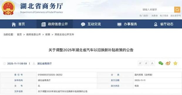 11月11日,湖北省商务厅发布公告,根据当前我省汽车以旧换新工作进展及资金使用情况,经研究,决定对2025年湖北省汽车以旧换新补贴政策进行调整。