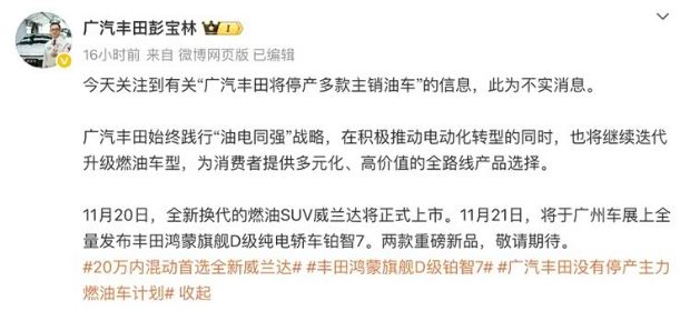 日前,广汽丰田销售副总彭宝林在社交媒体表示,关注到有关“广汽丰田将停产多款主销油车”的信息,此为不实消息。