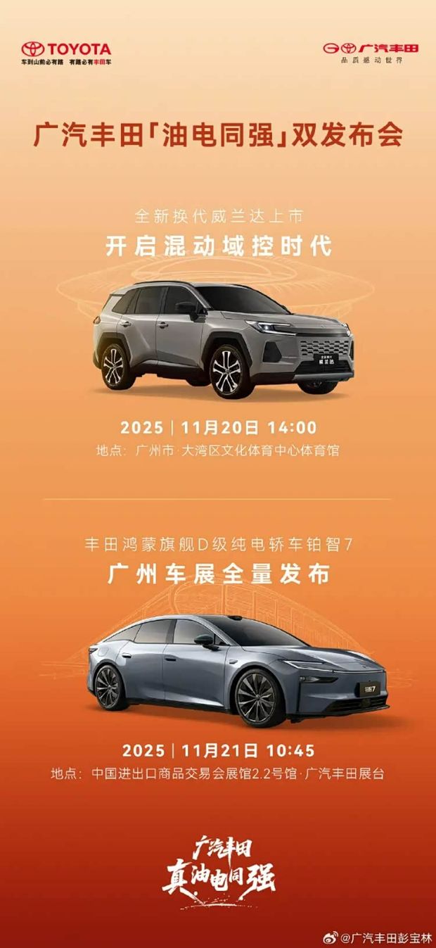 11月20日,全新换代的燃油SUV威兰达将正式上市。11月21日,将于广州车展上全量发布丰田鸿蒙旗舰D级纯电轿车铂智7。两款重磅新品,敬请期待。