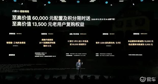 同时官方推出,三电和增程器终身质保;限时免费座舱、20寸星耀悬浮轮毂;6年每年1500度免费充电等购车权益。此外,小鹏X9老车主复购还有13500元的复购权益。