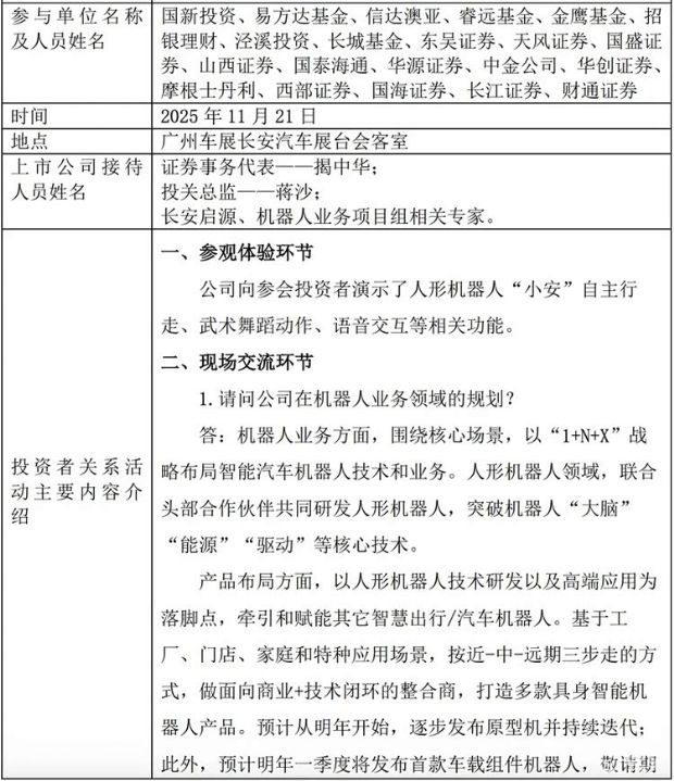 11月24日,长安汽车发布投资者关系活动记录表,机器人业务规划方面,公司基于工厂、门店、家庭和特种应用场景,按近-中-远期三步走的方式,做面向商业+技术闭环的整合商,打造多款具身智能机器人产品。预计从明年开始,逐步发布原型机并持续迭代;此外,预计明年一季度将发布首款车载组件机器人。