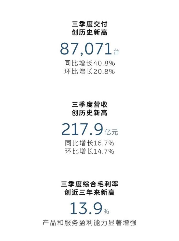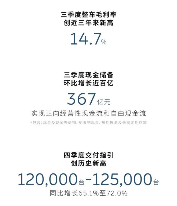 三季度营收217.9亿元,同比增长16.7%,环比增长14.7%,创历史新高。三季度综合毛利率13.9%,创近三年来新高,产品和服务盈利能力显著增强。三季度整车毛利率14.7%,创近三年新高。三季度现金储备367亿元,环比大幅增长近百亿,实现正向经营性现金流和自由现金流。四季度交付指引120,000台至125,000台,同比增长65.1%至72.0%,创历史新高。营收指引327.6亿元至340.4亿元,同比增长66.3%至72.8%,创历史新高。