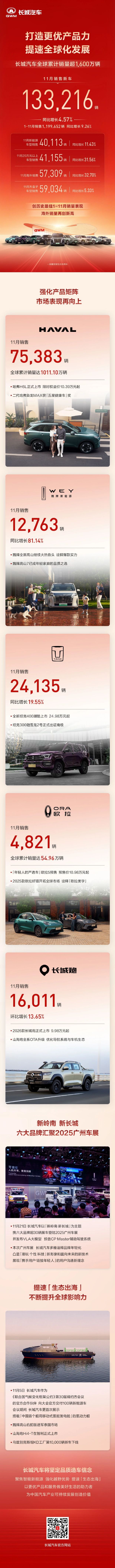 2025年11月,长城汽车交出亮眼销量答卷:单月新车销售133,216辆,同比增长4.57%;今年1-11月累计销量达1,996,52辆,同比增幅9.2%,创历史同期最佳表现。