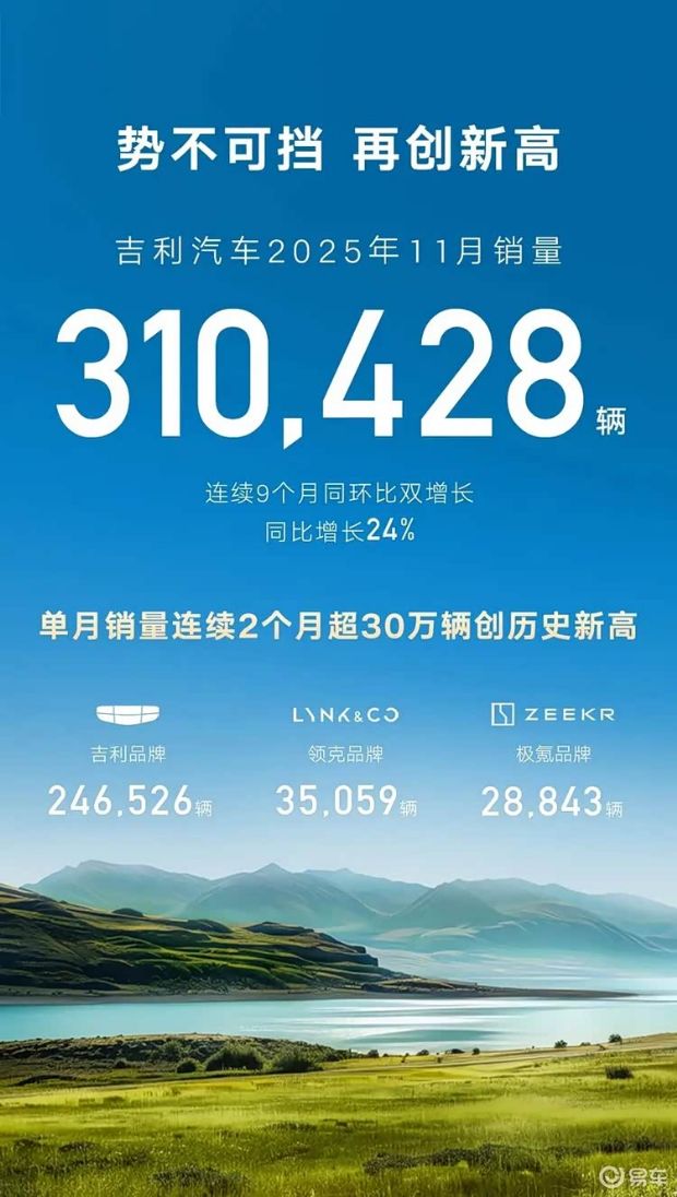 12月1日,吉利汽车公布最新销量数据,11月销量310428辆,同比增长24%,连续9个月同环比双增长。其中11月吉利品牌销量246526辆;领克品牌35059辆;极氪品牌28843辆。