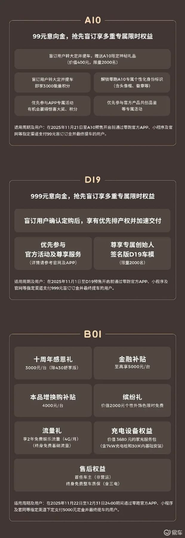 零跑A10推99元意向金可享多重专属限时权益,盲订用户转大定并提车,赠送A10限定神秘礼品以及3000能量积分。零跑D19推999元意向金,盲订用户确认订购后,享有优先排产权并加速交付以及限量2000名签名版D9车模。B01推出3000元/台感恩现金礼,至高5000元金融补贴以及本品赠换购补贴4000元等权益。