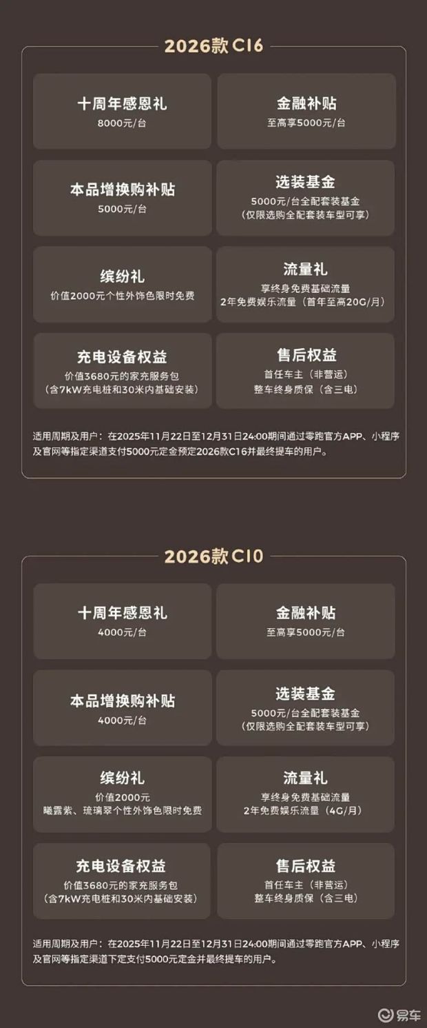 2026款C16享8000元现金优惠,至高5000元金融补贴,5000元本品增换购补贴,5000元选装基金,个性外饰色限时免费。2026款C10享4000元现金优惠,至高5000元金融补贴,4000元本品增换购补贴。