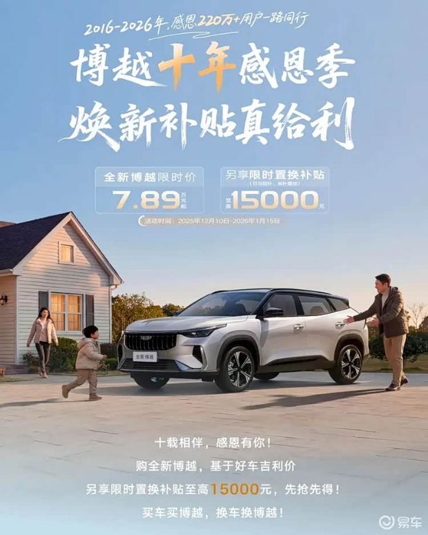 日前,博越官方发布,上市十周年感恩回馈,购车限时享至高15000元置换补贴。全新博越限时价7.89万元起,另享限时置换补贴至高15000元。