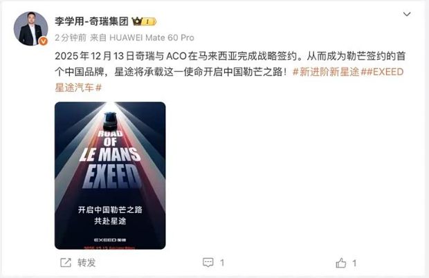 12月15日,奇瑞汽车执行副总裁李学用在社交媒体上宣布,12月13日奇瑞与ACO在马来西亚完成战略签约。从而成为勒芒签约的首个中国品牌,星途将承载这一使命开启中国勒芒之路。