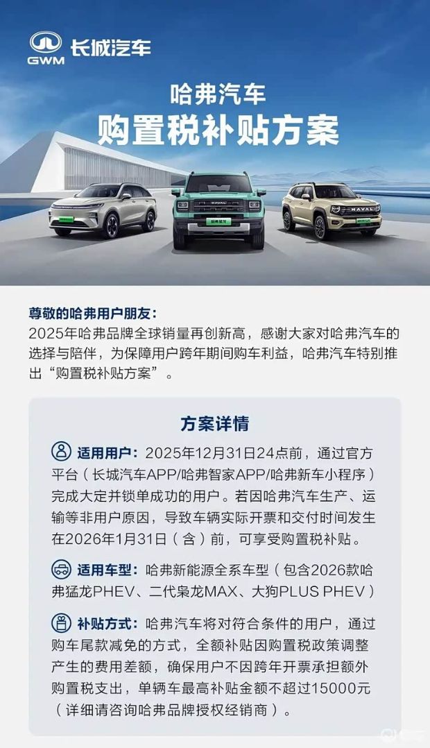 12月16日,长城汽车旗下哈弗品牌宣布推出跨年购置税补贴方案。2025年12月31日24点前,通过官方平台(长城汽车APP/哈弗智家APP/哈弗新车小程序完成大定并锁单成功的用户。若因哈弗汽车生产、运输等非用户原因,导致车辆实际开票和交付时间发生在2026年1月31日(含)前,可享受购置税补贴。