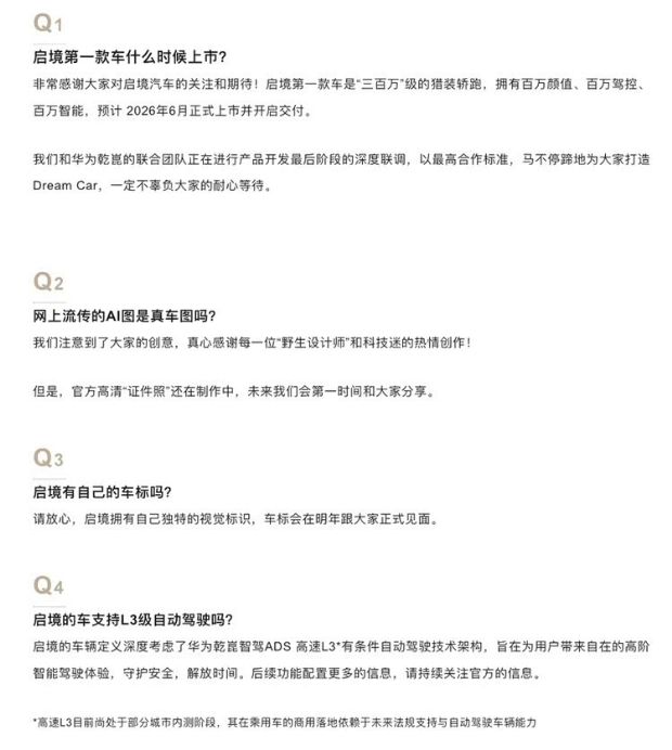 12月22日,启境汽车发布答网友问第一期内容。官方表示,启境第一款车是“三百万”级的猎装轿跑,拥有百万颜值、百万驾控、百万智能,预计 2026年6月正式上市并开启交付。