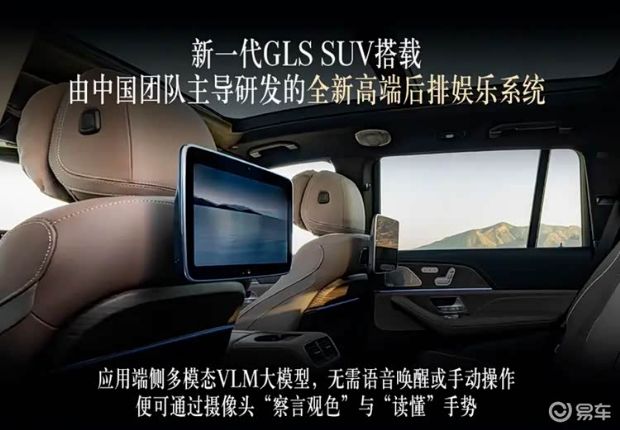 新一代GLS SUV所搭载的高端后排娱乐系统,为后排乘客同样带来了更智能的交互体验。两块11.6英寸全高清后排显示屏可供后排乘客畅享音视频内容,集成的全高清摄像头也为车内办公带来更多便利。全新高端后排娱乐系统由中国团队主导研发,应用端侧多模态VLM大模型,无需语音唤醒或手动操作,便可通过摄像头“察言观色”与“读懂”手势,为后排乘客调整出最舒适的座舱状态,并实时识别后排乘客的年龄区间、性别与状态,构建多维感知画像,AI智能化定向推荐娱乐内容和交互模式。此外,客户还可通过全新可拆卸式独立触控遥控器,便捷调节空调、车窗遮阳帘等功能,让舒适体验和个性化娱乐轻松触达。新一代GLS SUV标配全景式滑动天窗,超1平方米的玻璃覆盖整个车顶,为座舱引入充沛光线,并支持滑动开启。
