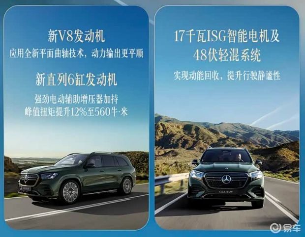 新一代GLS SUV的动力系统迎来全面进化,搭载全新升级的直列6缸与V8发动机,搭载48伏ISG智能电机系统。新直列6缸发动机,峰值扭矩提升12%至560牛·米。新V8发动机最大功率由380千瓦提至395千瓦,峰值扭矩由730牛·米提升至750牛·米。